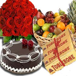 a blast of loveA bunch of fresh 12 pieces red rose, a basket of 8 items fruits, 6 pieces x 100 grams toblerone and a chocolate cake. |