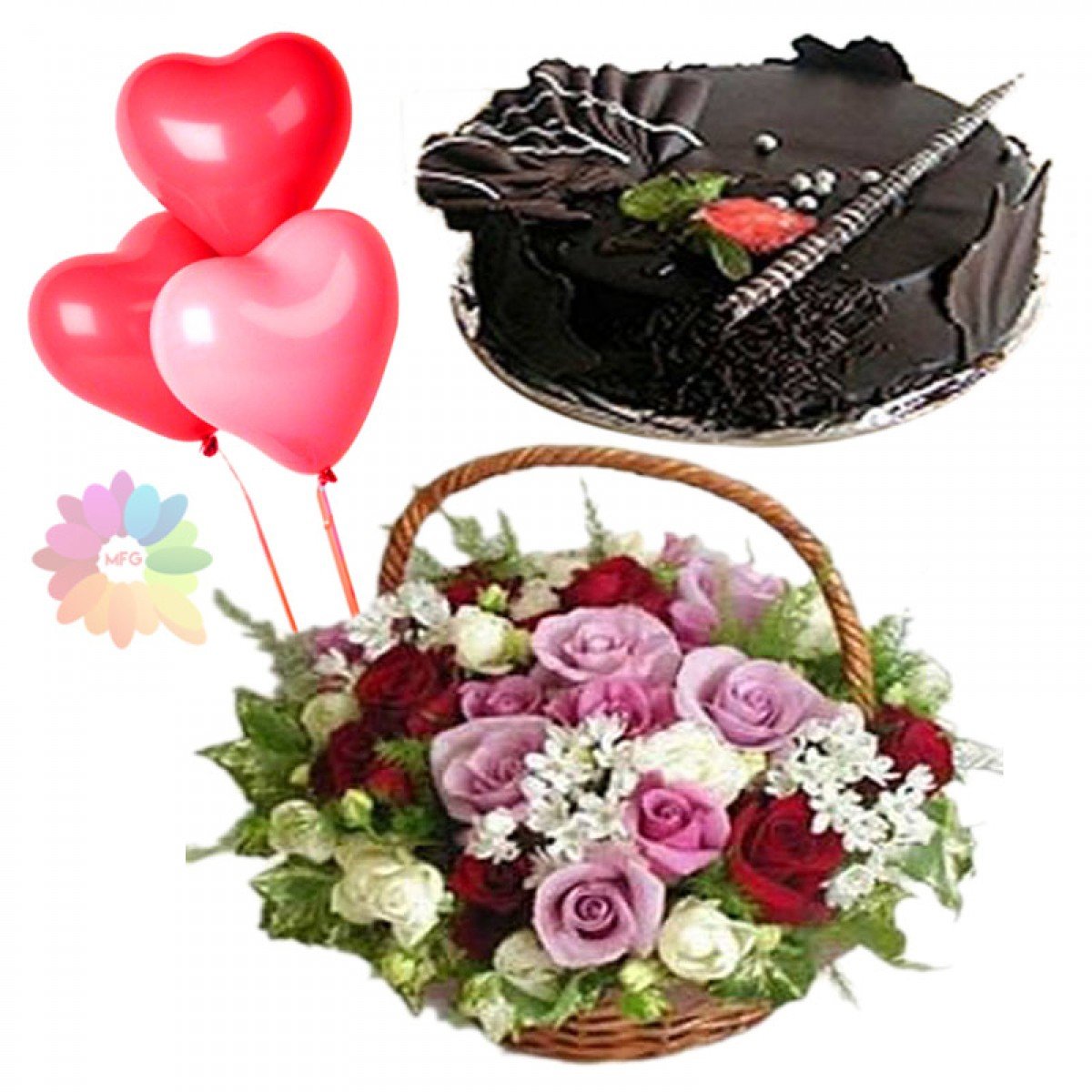 Birthday GIFts 2Basket of 24 mix colour roses with 1 pound chocolate fantasy cake with 3 heart shape balloons |
