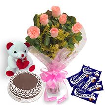 Bithday Celebrate w/loveCelebrate her special day with a gift of love.send her a flower(1dozen pink rose bouquet),5 pcs cadbury 65 g each and a cake , 8 " small teddy to make it a remarkable one. |