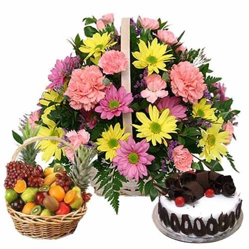 flower basket, cake & fruits