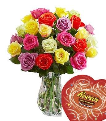 2 dozen Multi Color Roses w/ Reese's2 dozen Multi Color Roses w/ Reese's heart box. red pink orange pomelo peach |