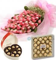 Blast of loveA bunch of fresh 24 pink rose, ,guylian heart box chocolates and 24 pcs ferrero. |