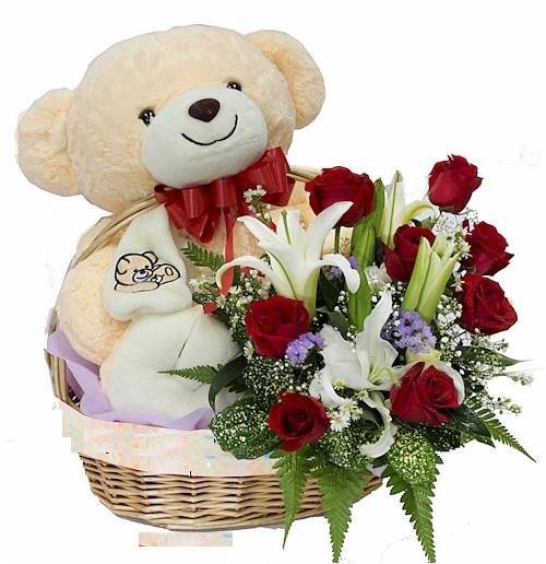 SWeet LOveSurprise her with this big cuddly light brown bear (24") come with red rose & white lily arrangement in a basket. Sure to bring a smile to anyone who loves bears. |