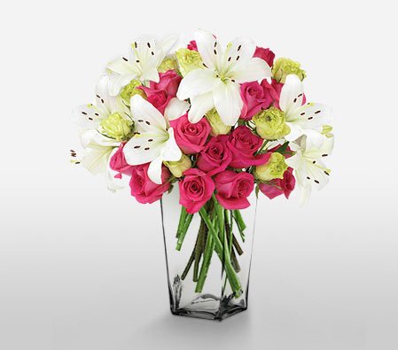 Bursting with style, color and extravagance, this luxurious arrangement featuring gorgeous pink and green roses surrounded by stems of white lilies arranged in a glass vase, will add charm and elegance to your loved ones day.
