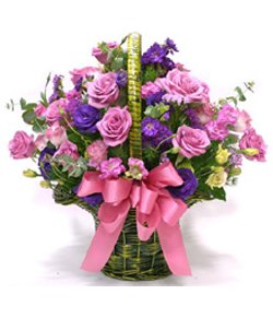 Purple Lucky12 purple roses(if this color is not available we will use pink roses to instead), 8 purple carnations, 5 pink carnations, match greenery, arranged in a small basket, pink ribbon. - Order two days ahead. The picture is only for reference and the main items are the same, the effect are guaranteed. |