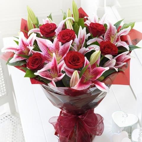 SWEET LOVEYour loved ones will be thrilled with a stunning bouquet of red roses and stargazer lilies. |