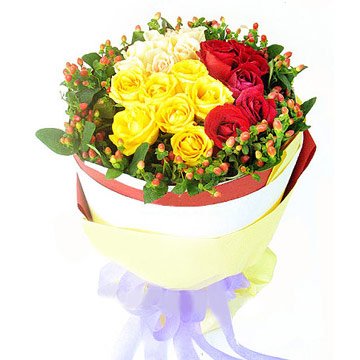 6 red 6 orange 6 white roses in bunch.