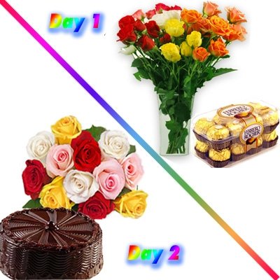 Colorful DreamsGive Colorful surprise to your near and dear one with this 2 Days Serenade which includes : Day 1 feb 13: 12 Multi color roses nicely arranged in a vase + Ferrero Rocher Chocolate Box (Net Weight : 200 gms). Day 2 february 14 : Bunch of 18 Multi Color Roses + 1/2 kg Chocolate Cake. |